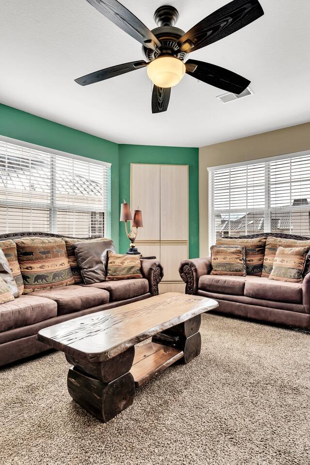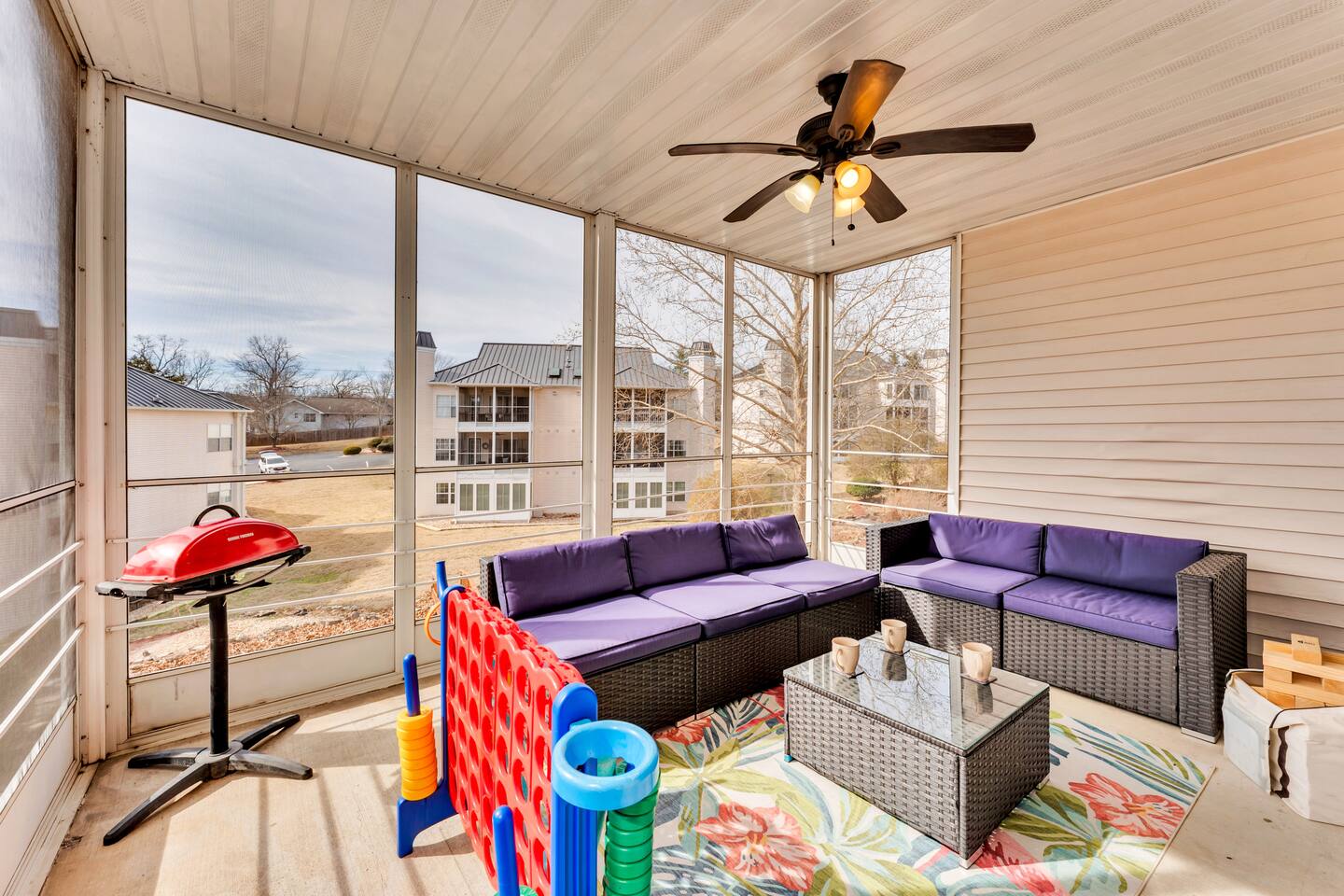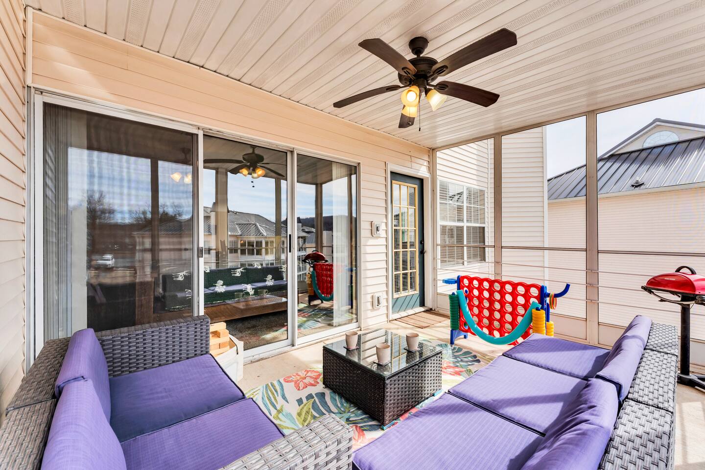 The spacious living room is perfect for family time, and the oversized screened-in patio is a guest favorite—featuring comfortable seating, peaceful views, and a grill for easy cookouts after a day exploring Branson attractions.