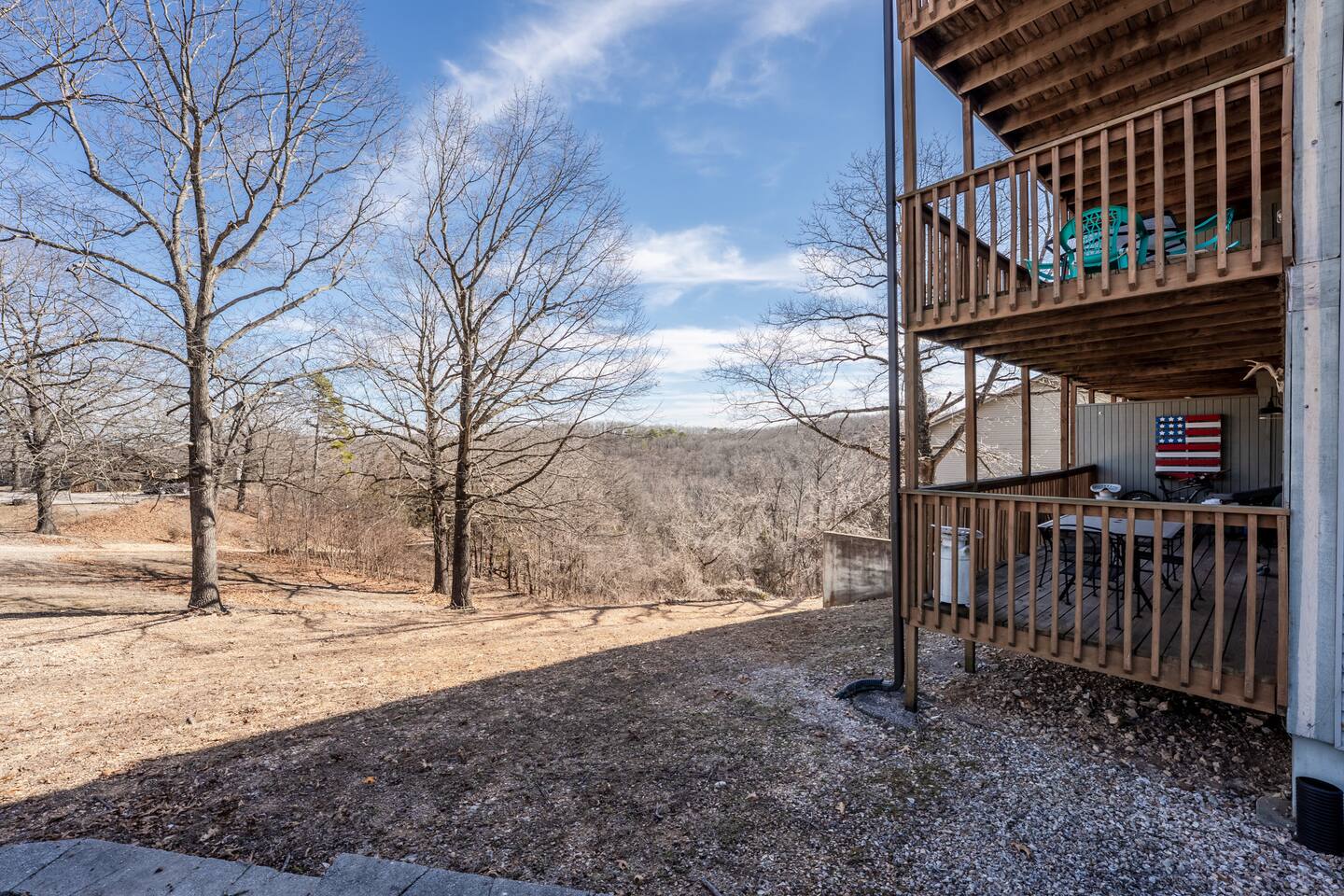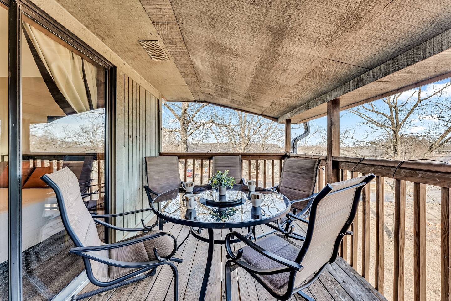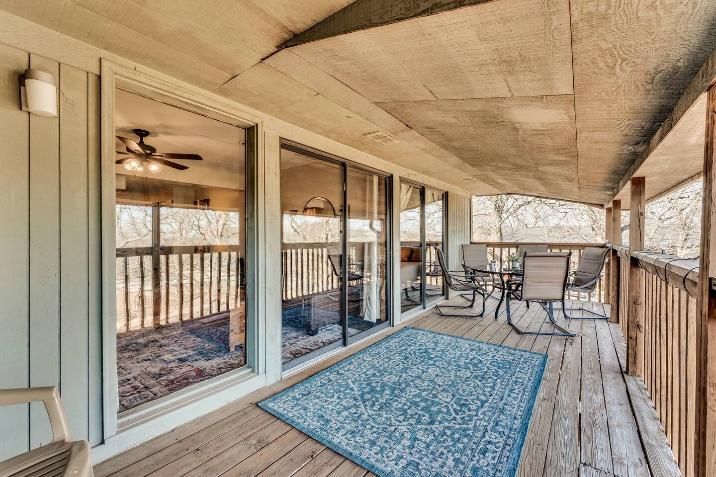 🌅 Private back deck with outdoor dining and serene views of the Ozark Hills